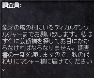 ウェルダン村NPC「マシャー」ウェルダン村のテレポート屋近くにいるNPC「マシャー」の話を聞きます。 2)黄昏の山脈にいるNPC「ジーム」 ![]() 黄昏の山脈にいるNPC「ジーム」の話を聞きます。 ジャイアントガーディアンを見るには、ナイトビジョンというアイテムが必要であることを言われます。 この段階で、必ず「マシャー」と「ジーム」の会話を聞き終っていなけばなりません。 (3項でのナイトビジョンが手に入らなくなる為) 3)ギラン北東の森に出現する「バンディットスモールボス」 ![]() ギラン北東の森に出現する「バンディットスモールボス」を倒します。 こちらに関しては、それほど強いものではありません。 これを倒すと、「ナイトビジョン」を手に入れる事ができます。 ![]() 4)長老「ジャイアント エルダー」 まずクリアポーション100個以上を持って黄昏の山脈へ行きます。 ![]() 傲慢の塔近くにいるジャイアントエルダーに話しかけます。 ここで必ずジャイアントエルダーに話しかけていなければなりません。 (5項でのガーディアンの袋が手に入らなくなる為) 5)「ジャイアントガーディアン」を倒す この時に、ナイトビジョンを装備しておきます。 山脈に出現する「ジャイアントガーディアン」を倒します。 ナイトビジョンを装備しておかないと見る事ができません。 ジャイアントガーディアンはとても強く、クリアポーション連打+ウィザードのヒールの手助けをしてもらった方がよいでしょう。 ![]() 倒すと「ガーディアンの袋」をもらえます。 これをダブルクリックして、「破けた調査書」「ヘブンソード」「古代の遺産」を手に入れます。 ![]() 6)NPC「ジャイアントエルダー」へ さきほどのジャイアントエルダーへ「古代の遺産」を渡します。 すると「古代のキーの一部」をもらえます。 7)調査員 次に、山脈に出現するジャイアントの姿をした「調査員」を探します。 この調査員にウィザードやエルフの協力を得て、魔法(キャンセレーション)をかけます。 すると本来の姿になり、象牙の塔の村までつれていくように言われます。 ![]() テレポート、帰還をしてもついてこないので歩いていくしかありません。 8)象牙の塔の村へ 象牙の塔の村の左端にいる「ディカルディン ソルジャー」へ調査員を連れて行きます。 ![]() すると調査書の破片をもらえます。 9)ウェルダン村のNPC「マシャー」へ この「調査書の破片」と「ナイトビジョン」「破けた調査書」をウェルダン村にいるNPC「マシャー」へ渡します。 ![]() ブレイブベルト AC1 HP+30 装備可能 ナイトのみ 材質:布 重さ:50 ブレイブベルトを手に入れることができます。 この段階で手元には、「ブレイブベルト」「古代のキーの一部」「ヘブンソード」が残る事になります。 |
